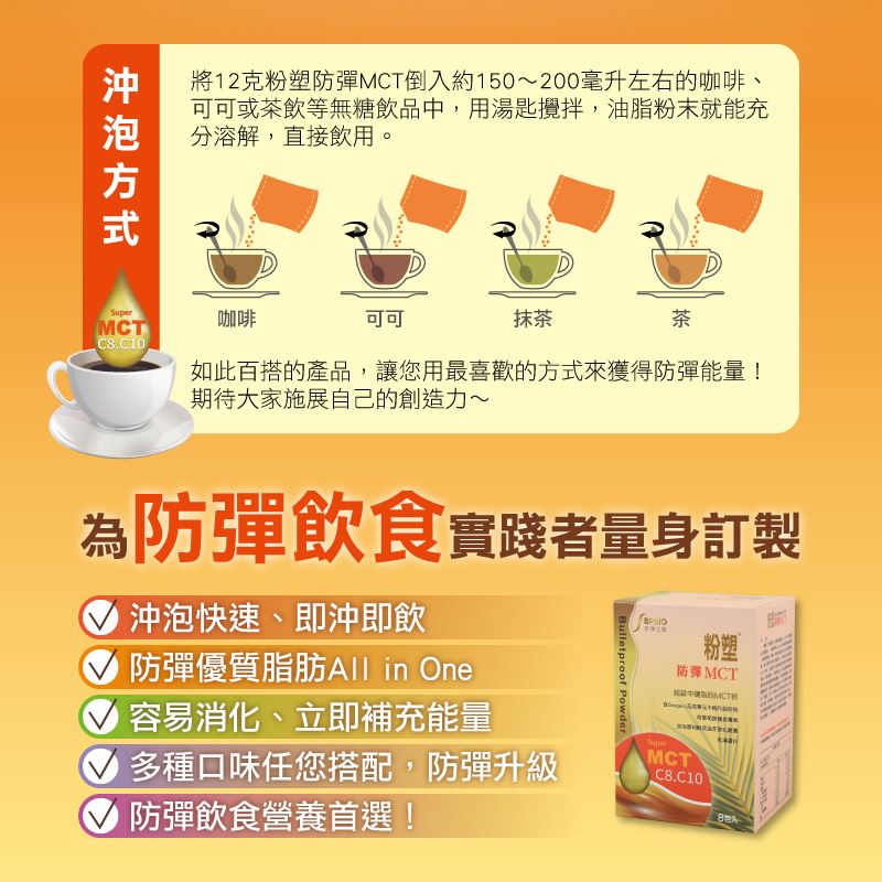 隨著“防彈飲食”的新飲食觀念,人手一杯防彈飲品已是潮流。「粉塑防彈MCT」配方依照防彈咖啡理論,無添加蔗糖、奶精,將含有黃金混合比例之優質精製椰子油和草飼黃油的防彈油粉,搭配超級中鏈脂肪(MCT)油粉,大幅提升好油脂含量並有更好的能量提供效益,可增強體力、使精神旺盛。且添加美國專利耐高溫芽孢乳酸菌與菊苣膳食纖維,可促進腸道蠕動、改變細菌叢生態、維持消化道機能正常。本品適用於各種飲品,如咖啡、可可、茶飲等,其方便沖泡的特性,更是每天搭配“防彈飲食”食譜不可或缺的防彈MCT油粉!亦可隨意搭配蔬菜沙拉食用,如此百搭的產品,可施展自己的創造力,用喜歡的方式來獲得防彈能量!